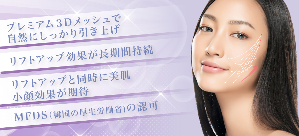 3Dメッシュとバーブ(トゲ)のついた特殊な糸を使用します。皮下組織にこの特殊な糸を挿入することで、バーブがしっかり皮下組織に食い込み、周辺組織が3Dメッシュ内に入り込むことでリフトアップ効果が見込めます。この糸はMFDS(韓国の厚生労働省)認可取得の安全性の高い溶ける糸を使用します。