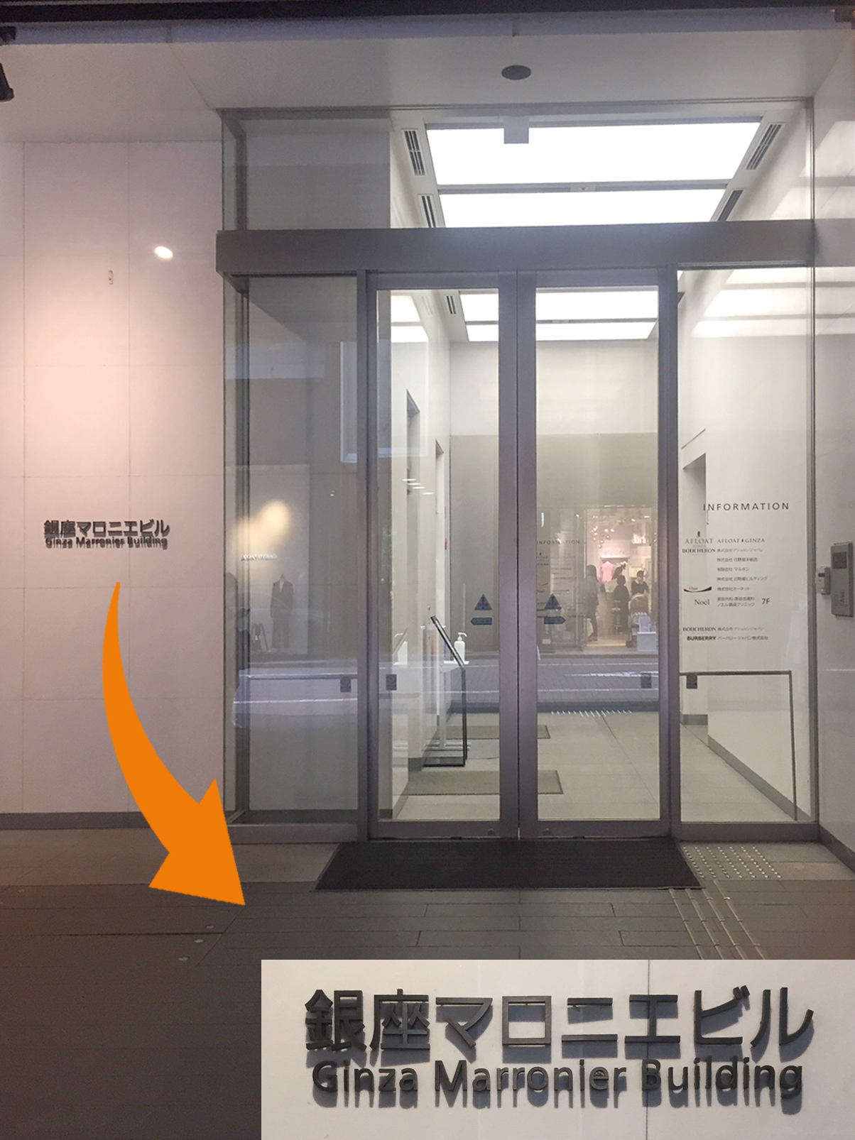 1FにBURBERRYが入っているビルになります。エントランス(エレベーターホール)は写真左の銀座レンガ通り沿い、ビルの奥側にございます。